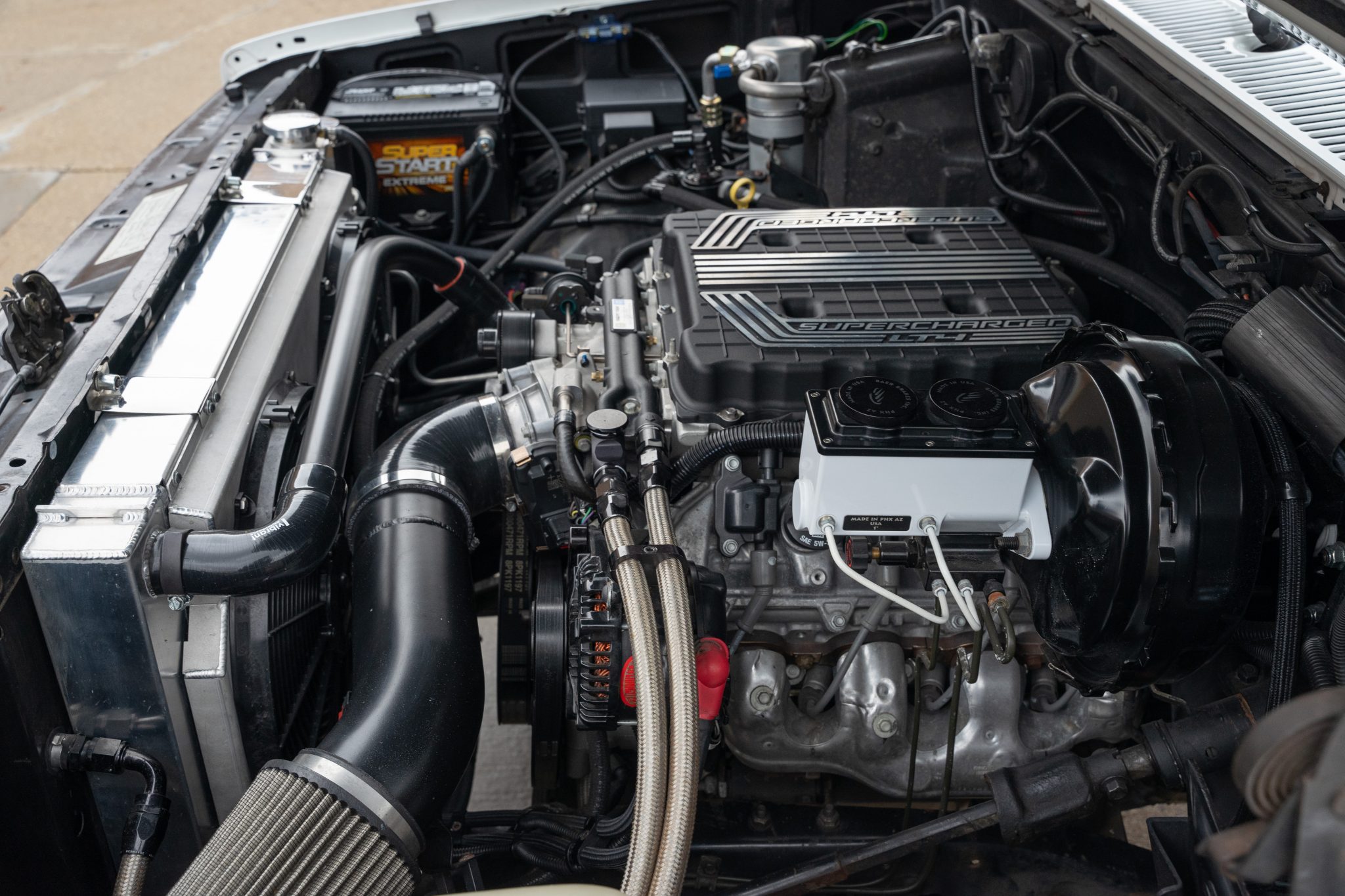 Supercharged LT4 V8 in engine bay of a 1989 Chevy Blazer