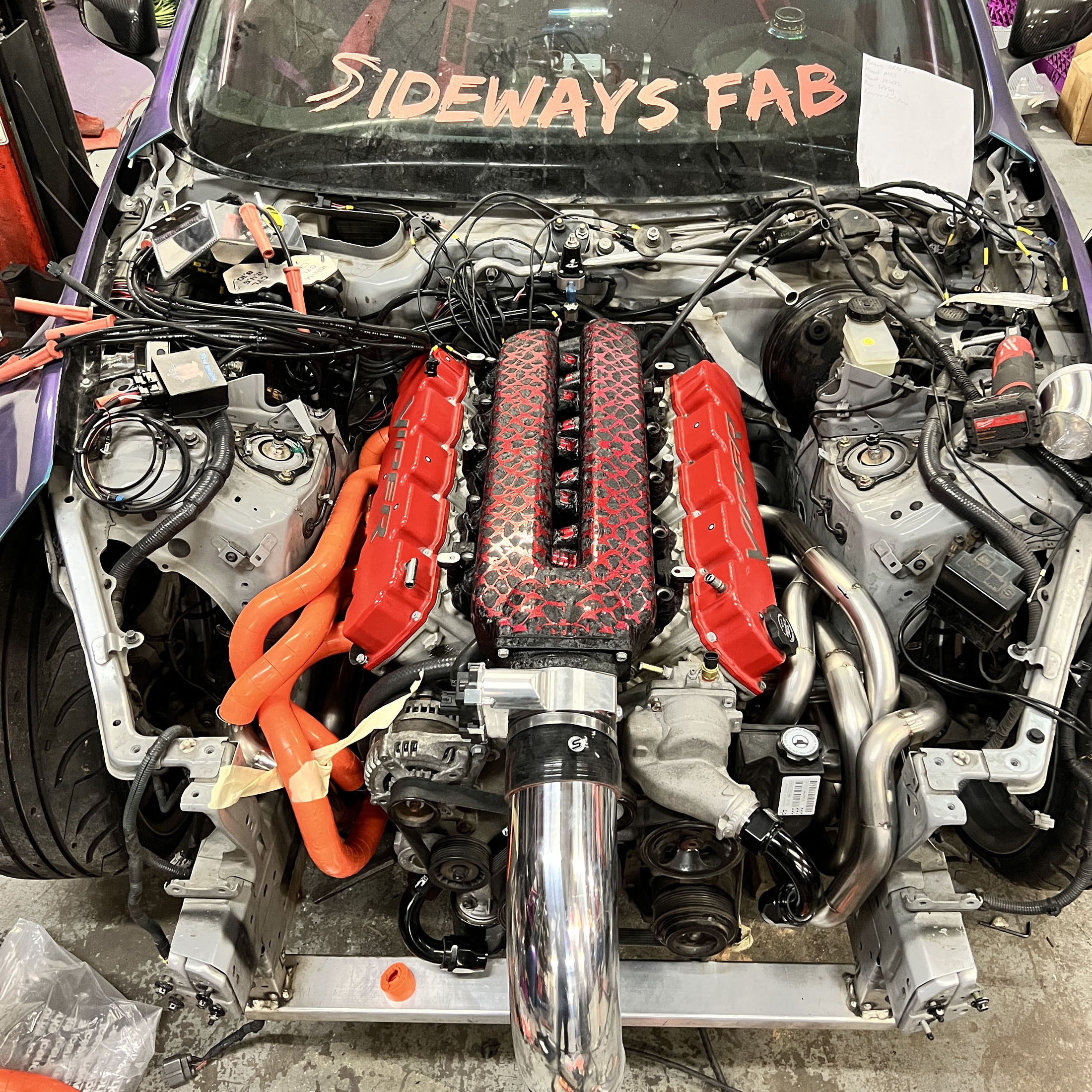 Viper V10 and custom exhaust headers in a Nissan 370Z engine bay