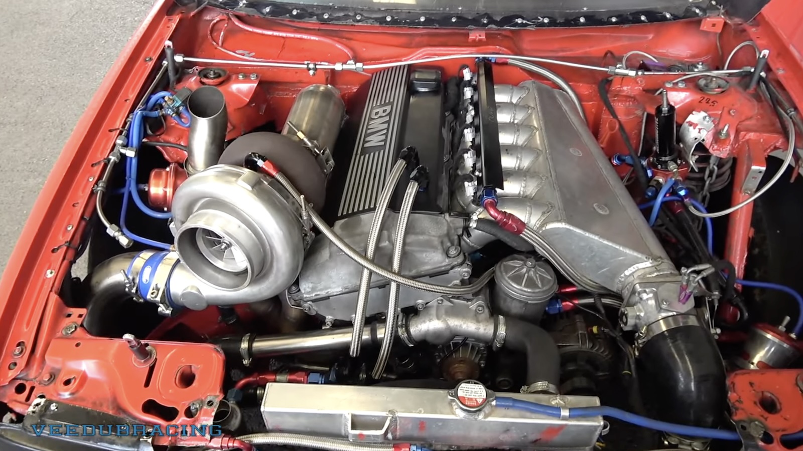 turbocharged 3.1 L BMW M50 inline-six in the engine bay of an Audi S2 race car