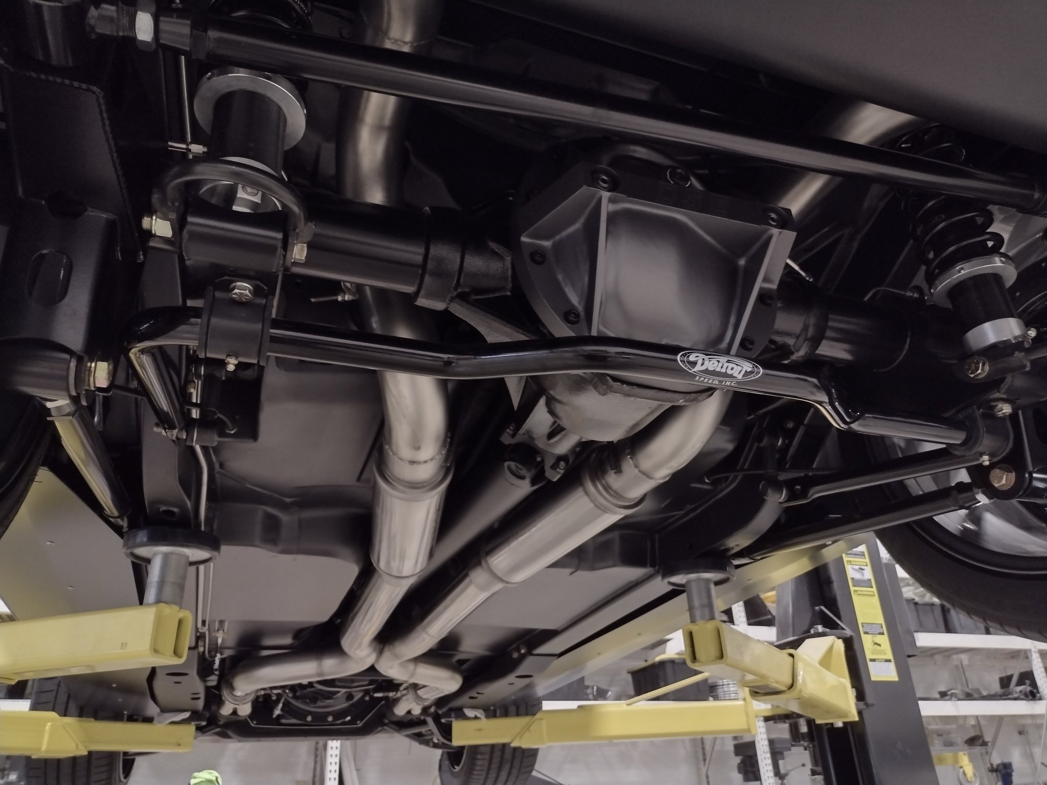 underneath view of the rear suspension and exhaust on a 1969 Camaro