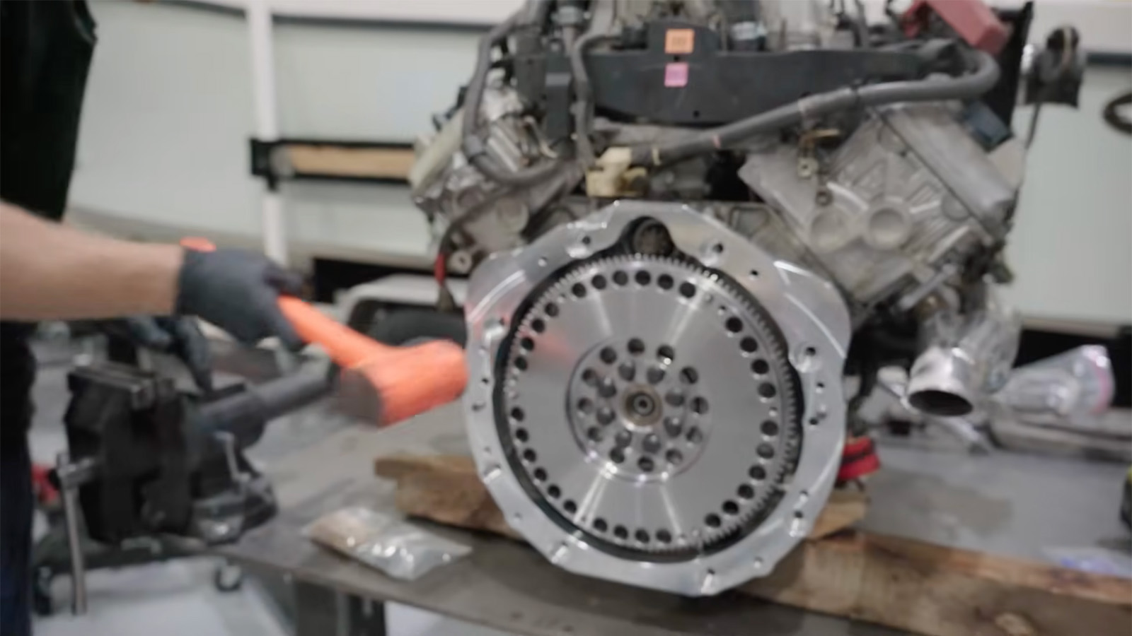 Collins adapter being installed on a 3UZ V8 for a FRS six-speed manual transmission